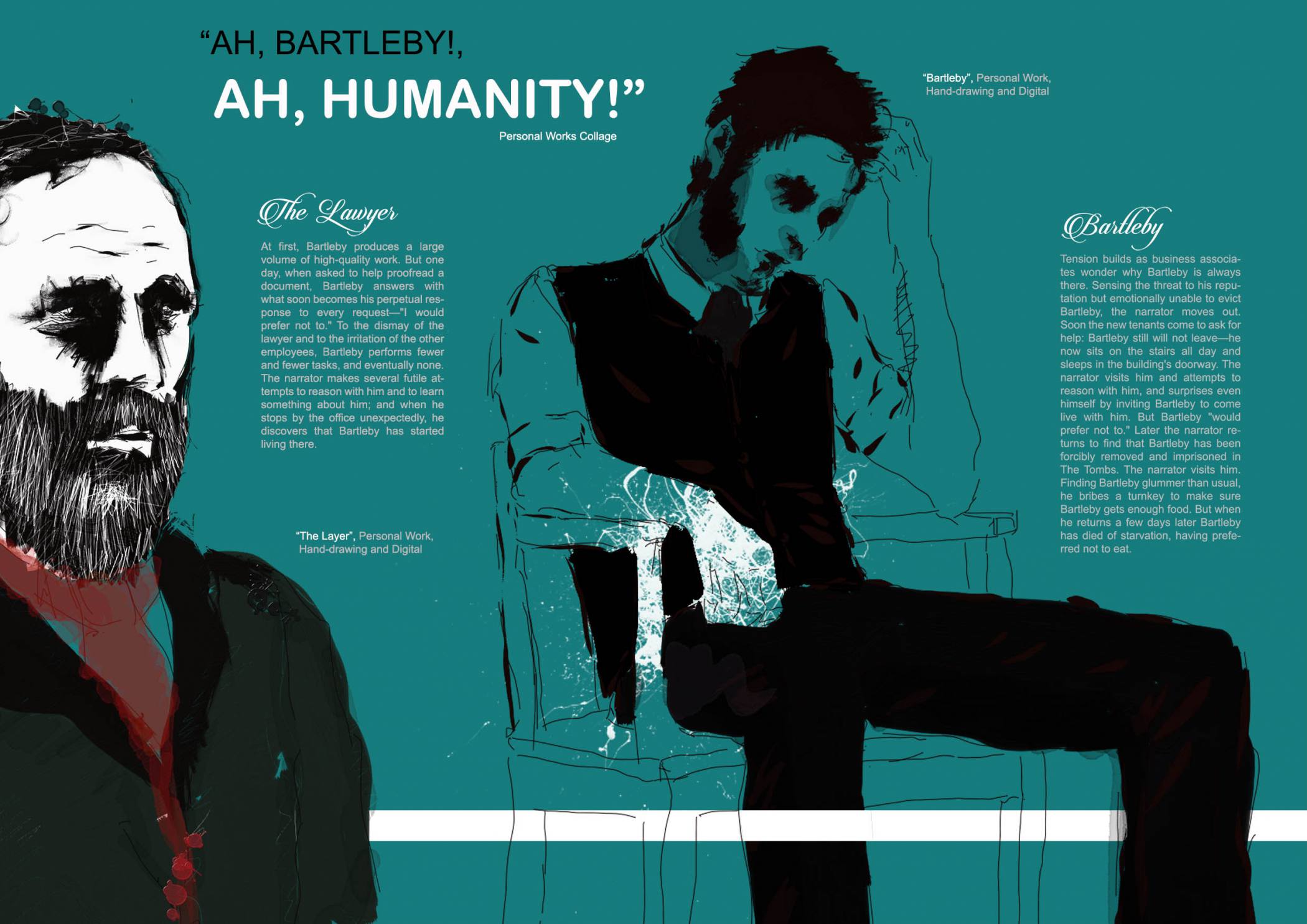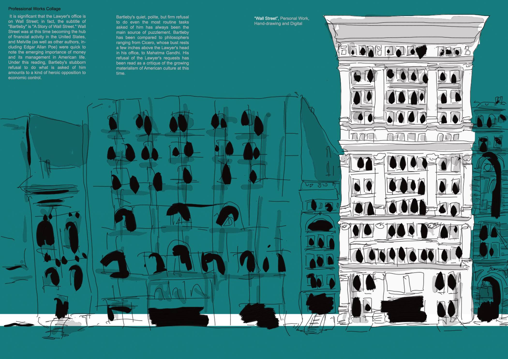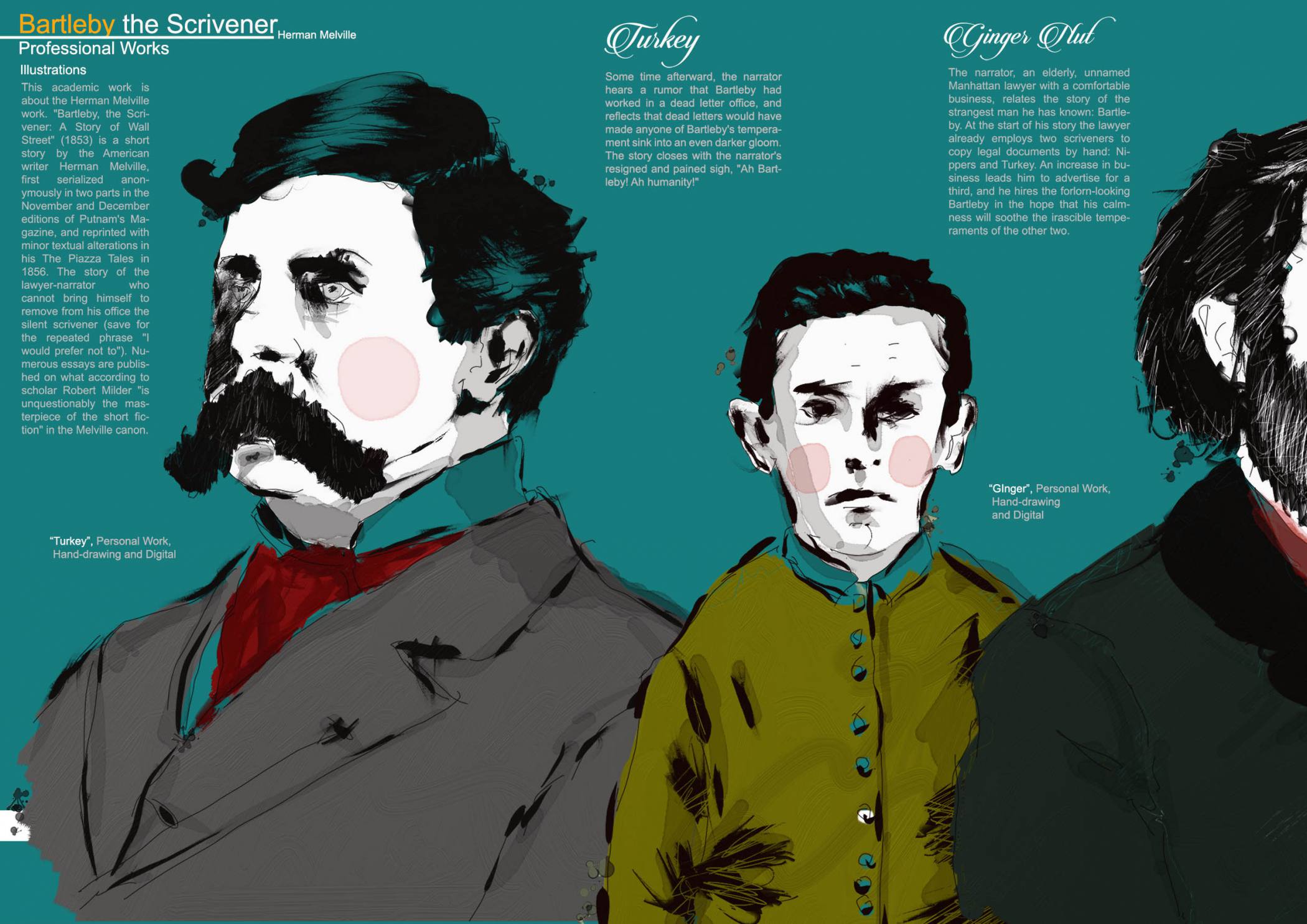 Trabajo de ilustración universitario para el libro Bartleby The Scriviner del escritor Herman Melville. Trabajamos el desarrollo de los personajes y su caracterización para adecuarlos en su contexto histórico, del mismo modo, realizamos un estudio previo de la calle Wall Street para entender la arquitectura de la época.
