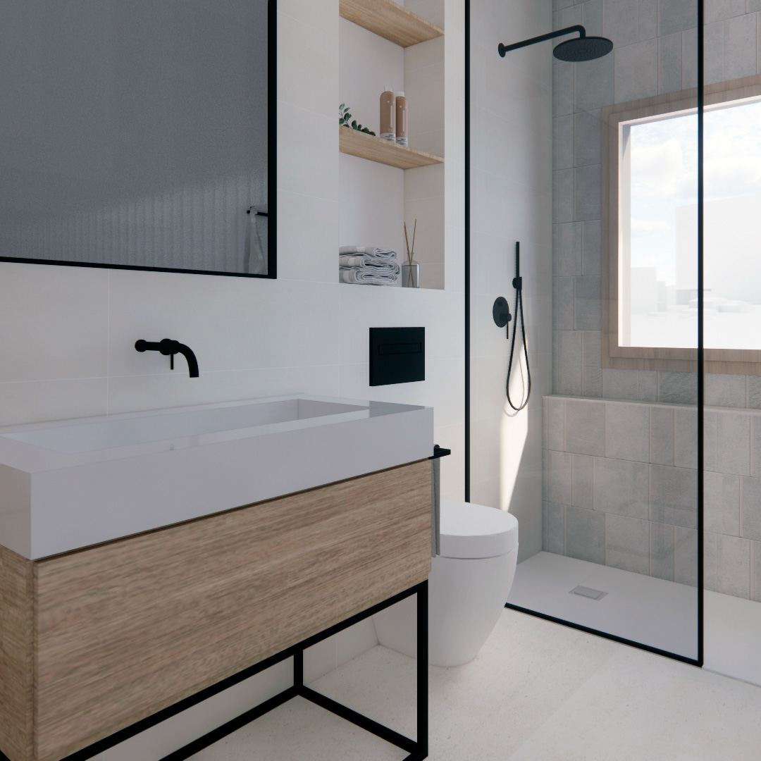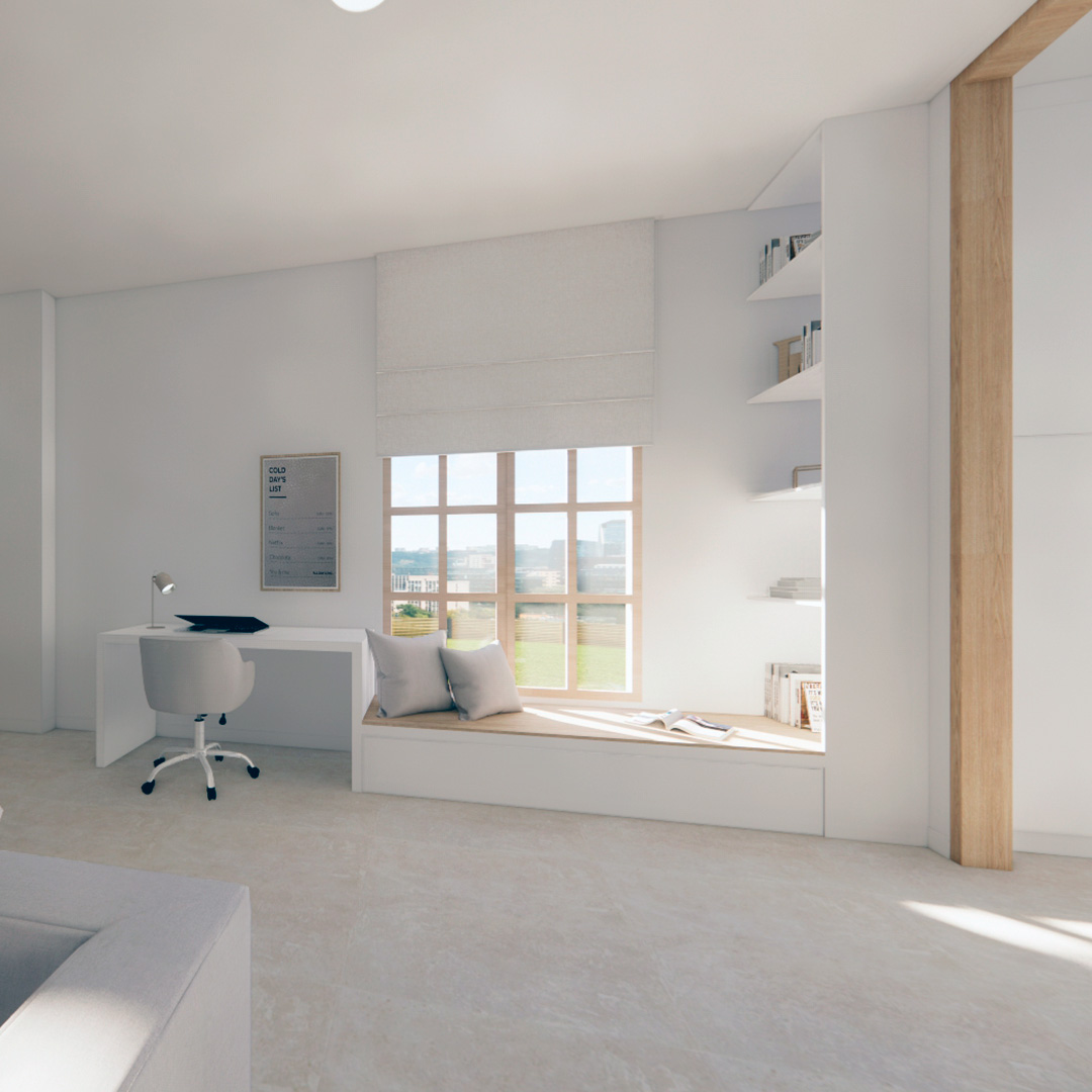 Proyecto de interiorismo en el que predominan los tonos tierra, grises y blanco.