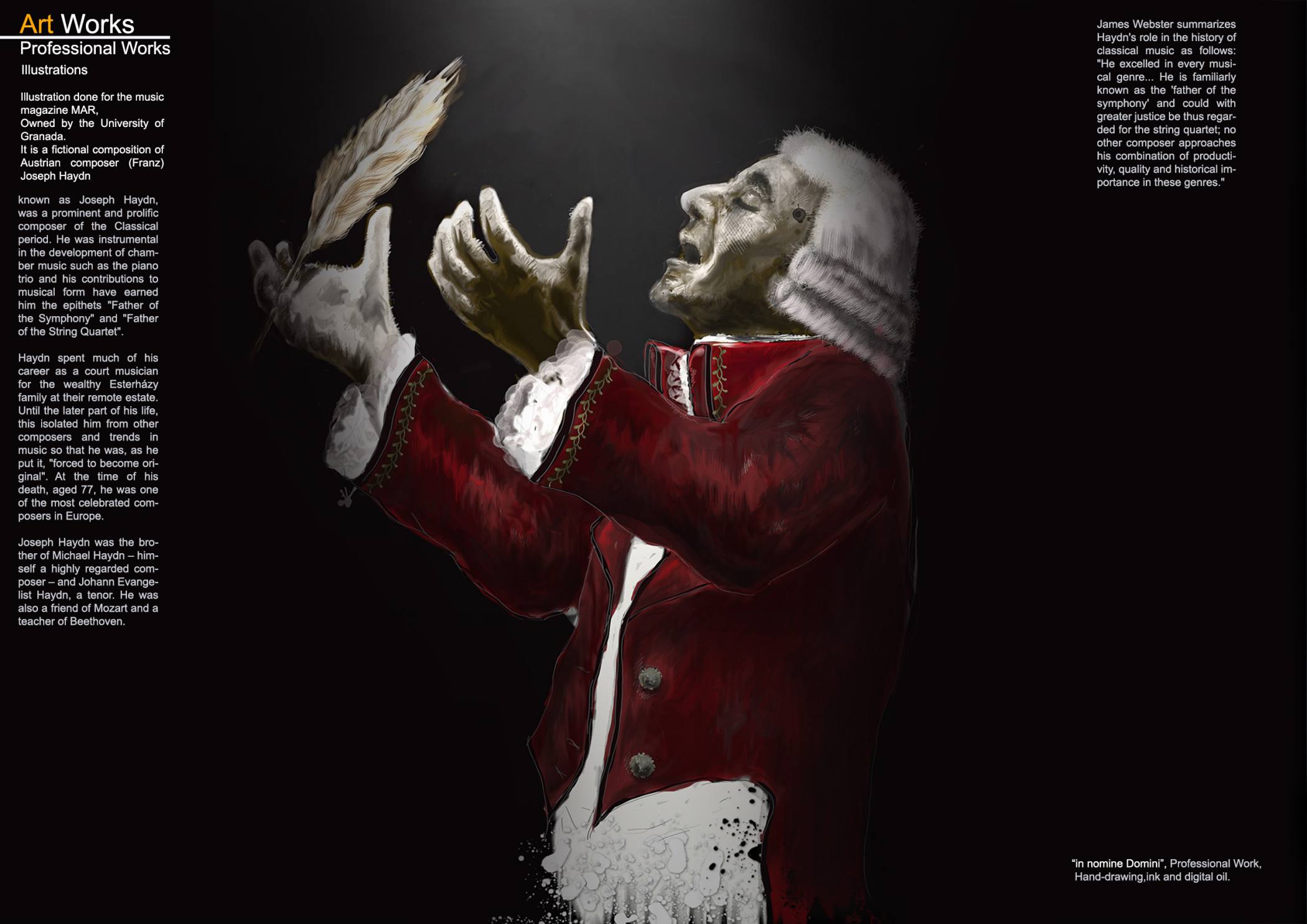 Trabajo de ilustración para la revista de musicología MAR, de la Universidad de Granada. En este caso ilustramos al austriaco Franz Joseph Haydn, conocido como el padre de la sinfonía y siendo uno de los compositores más celebres de la época.