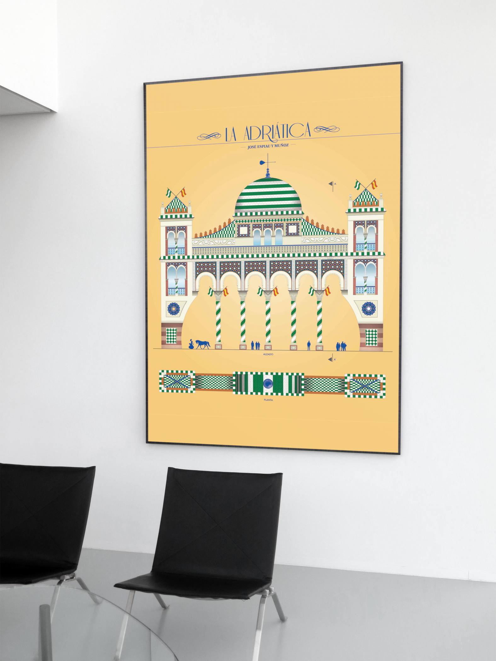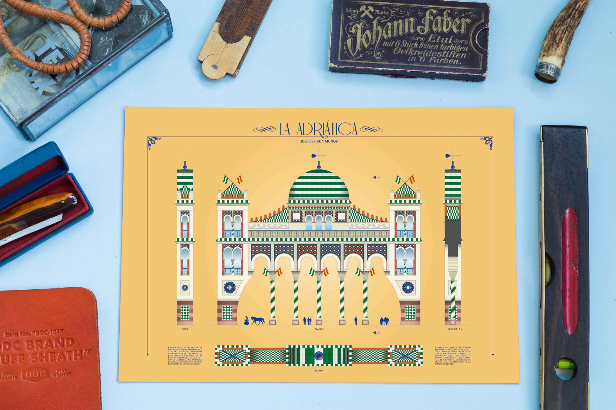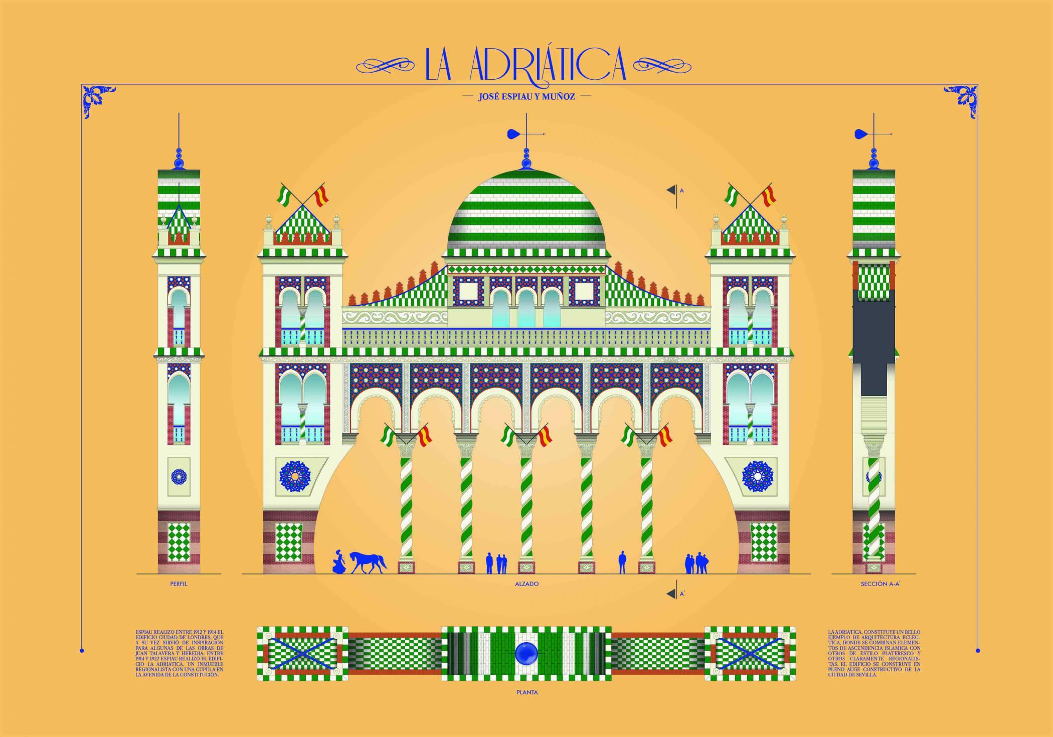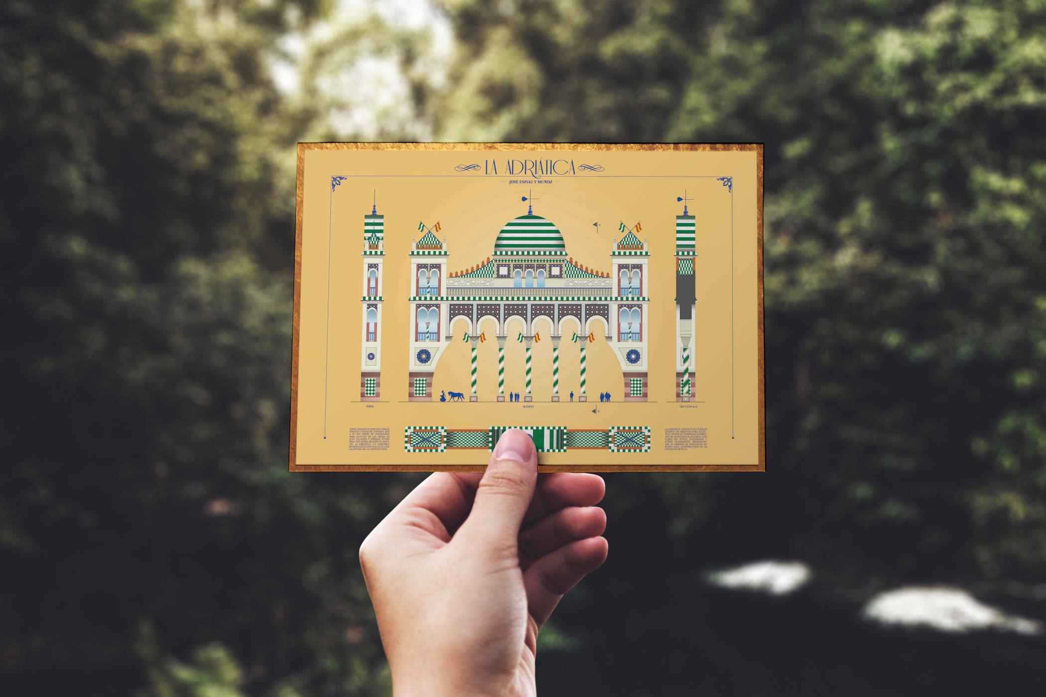 Propuesta finalista ilustrada para la portada de la feria de Abril de Sevilla 2020. La Adriática, constituye un bello ejemplo de arquitectura ecléctica, donde se combinan elementos de ascendencia islámica con otros de estilo plateresco y otros claramente regionalistas. El edificio se construye en pleno auge constructivo de la ciudad de Sevilla.