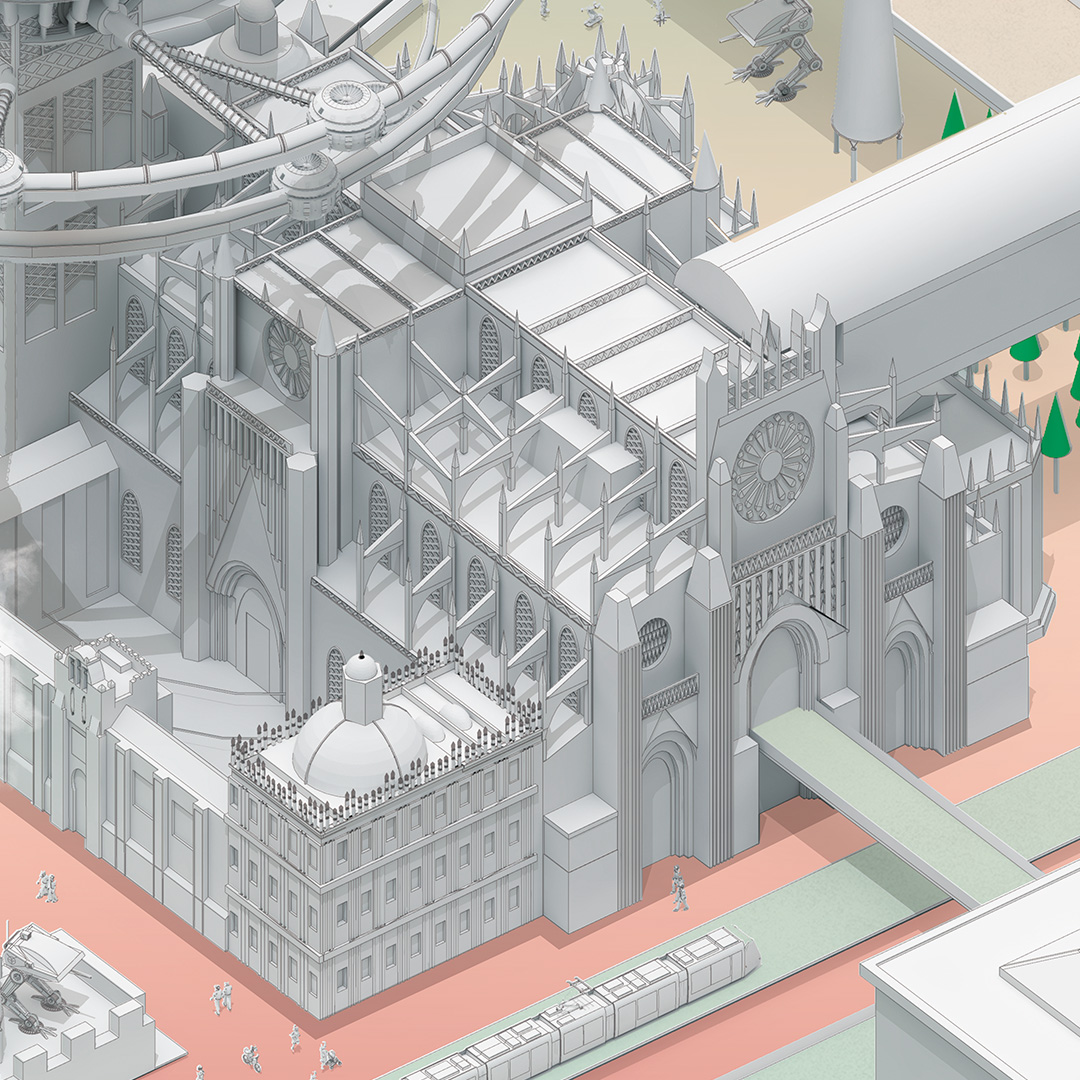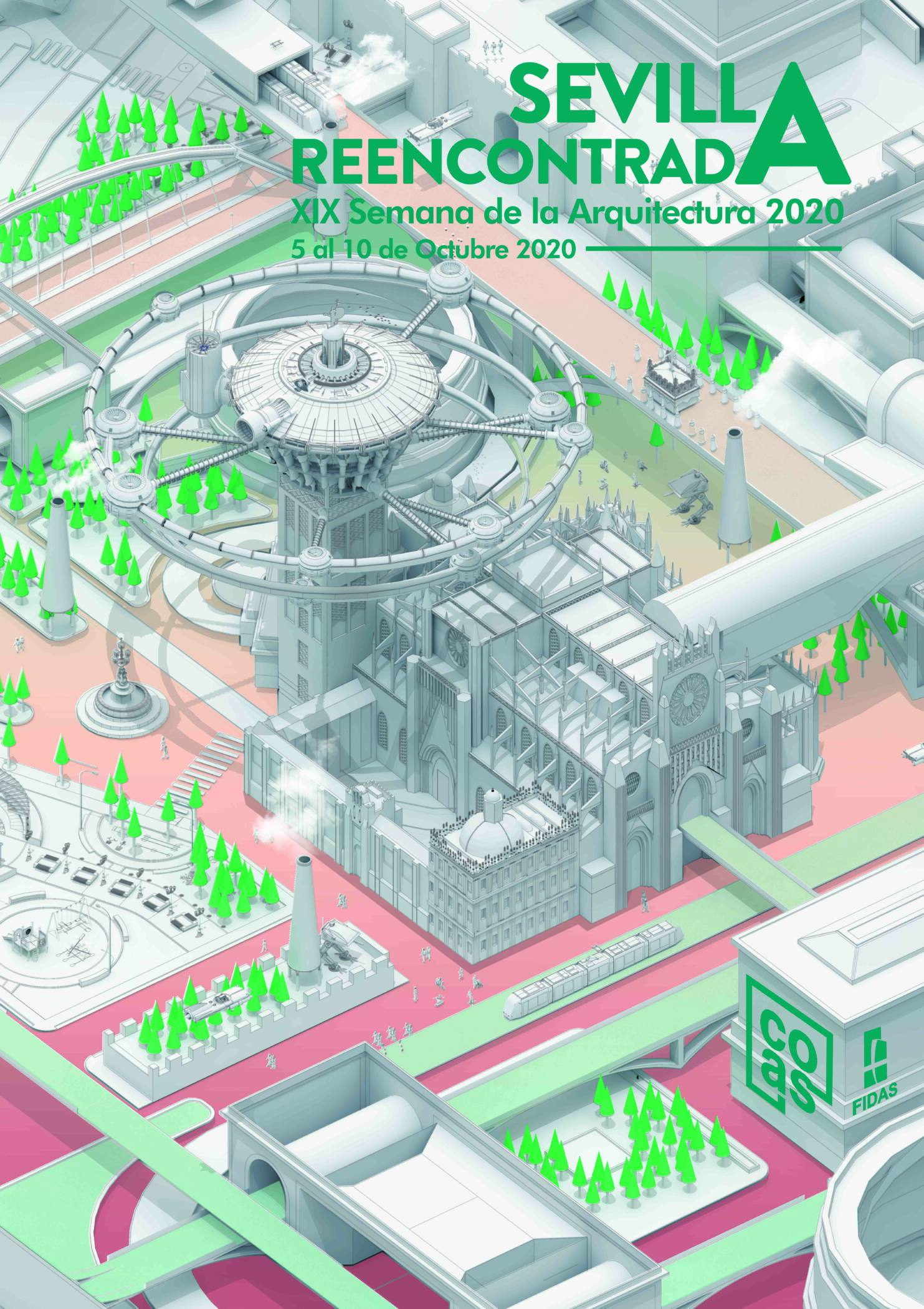 Propuesta de estudio para el cartel «Sevilla reencontrada / XIX Semana de la arquitectura 2020». Nuestra intención fué mostrar una Sevilla futurista, ¡una Sevilla imaginada!